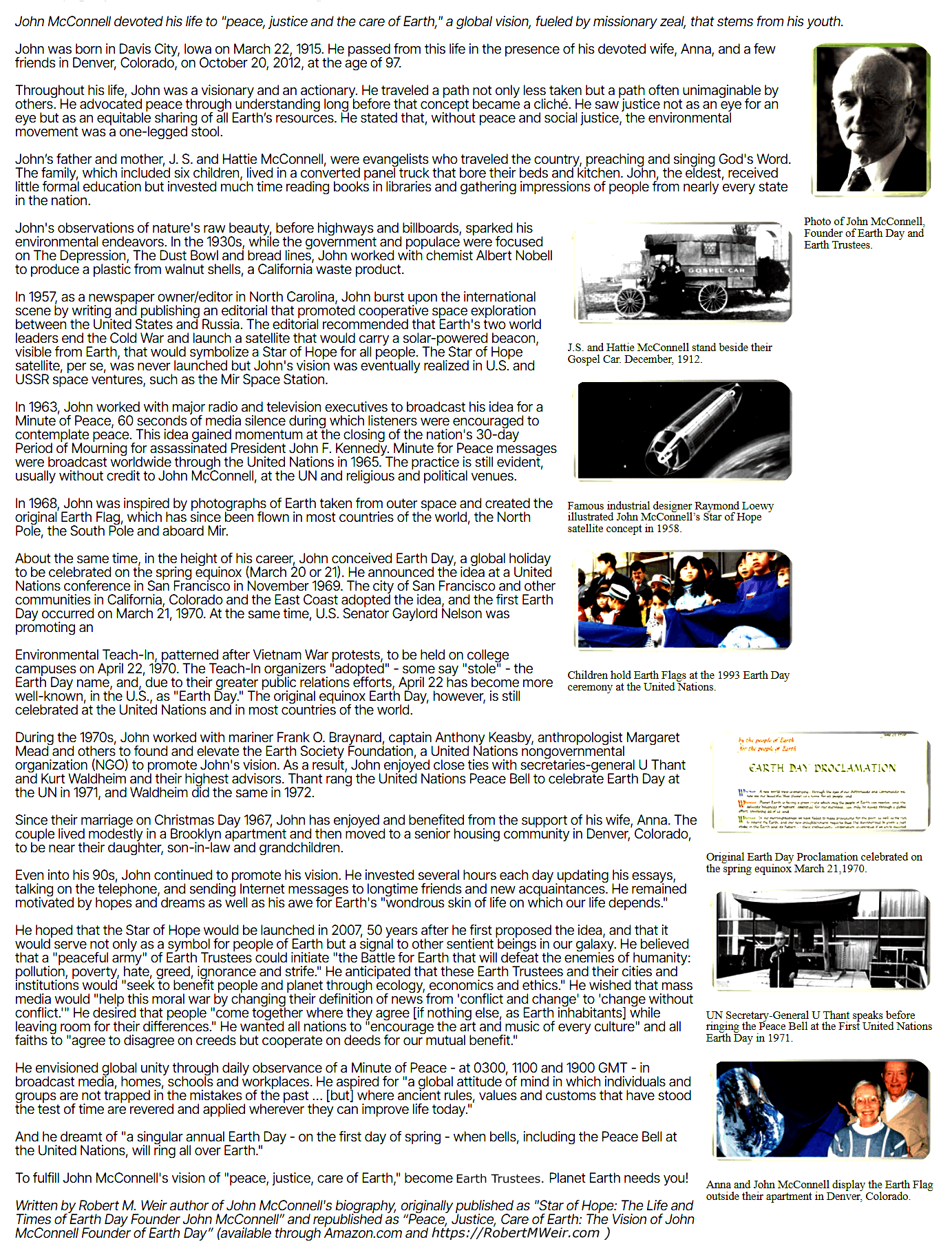 Mr. McConnell wrote the Earth Magna Charta, in which he sought to incorporate the goals and policies needed for "peace, justice and the care of Earth."